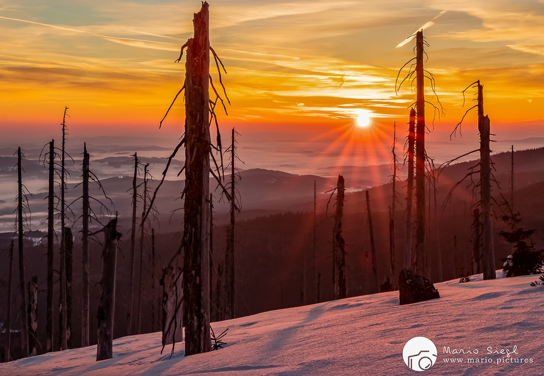 Der Plöckenstein ist ein 1378 Meter hoher Berg im Böhmerwald auf der österreichisch-tschechischen Grenze. Bizarr stehen leblose Baumruinen entlang des Kammes und erinnern an den Sturm Kyrill 2007 und die folgende große Borkenkäferplage. Im Winter aber ändert sich dieses Bild, da sind die Bäume dann sehr oft von Eis und Schnee bedeckt und liefern dadurch einen imposanten Anblick. Als ich eines Morgens im Winter vor Sonnenaufgang mit Stirnlampe und Schneeschuhen Richtung Gipfelkreuz startete, sah ich aber relativ schnell das dieser eindrucksvolle Anblick heute nicht stattfindet. Bei der Anreise mit dem Auto stellte ich aber fest, dass sich einige Nebelfelder im Tal hielten und spekulierte daher auf einen schönen Sonnenaufgang. Bei meiner Ankunft am Gipfel sah ich dann, dass ich richtig spekuliert hatte und ich bekam einen herrlichen Sonnenaufgang mit toten Bäumen und Nebel im Tal vor die Linse. Alles in allem hatte ich dann an diesem Morgen zwar kei...