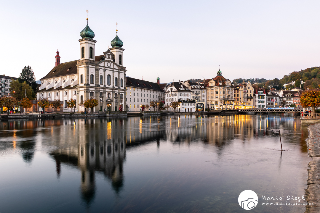 Pünktlich zum Sonnenuntergang standen wir dann wieder mit unseren Kameras ¹ auf der Aussichtsplattform. Nachdem die Sonne sich verabschiedet hatte, machten wir noch einige Aufnahmen während der Blauen Stunde, bevor wir mit der Rigi-Bahn wieder ins Tal hinabfuhren. Angekommen im Tal setzten wir unsere Reise mit dem Auto fort und fuhren nach Luzern, wo wir die Nacht in einer Jugendherberge verbrachten